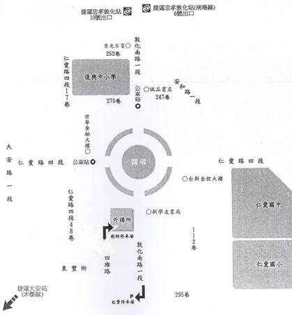 交通路線 (一)公車: 仁愛路線:245、270、37、621、651、263、261、311、藍543、630、665 敦南路線:0東、41、275、292、902、906、33、52、285、630、905、909 (二)捷運: 忠孝敦化站(板南線)下站後約步行5∼10分鐘 大安站(木柵線)下站後約步行10∼15分鐘 (三)開車: 地下室停車位數量有限,對外僅提供課程講師使用 來賓可至敦化南路之收費停車場,或東豐街等路邊停車格